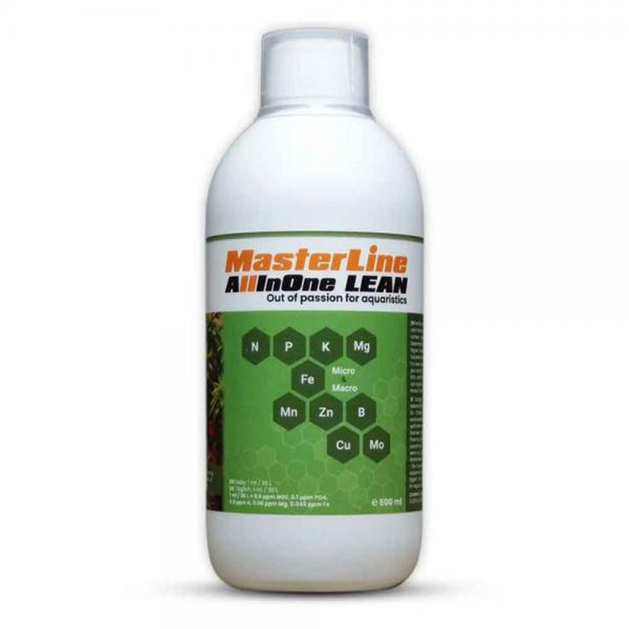 MasterLine All In One Lean offre tutti i nutrienti essenziali per le piante acquatiche in un'unica formula. Composizione: 0,41% azoto, 0,1% fosforo, 2,4% potassio, 0,24% magnesio, 0,14% ferro, insieme a tracce di manganese, zinco, boro, rame e molibdeno.