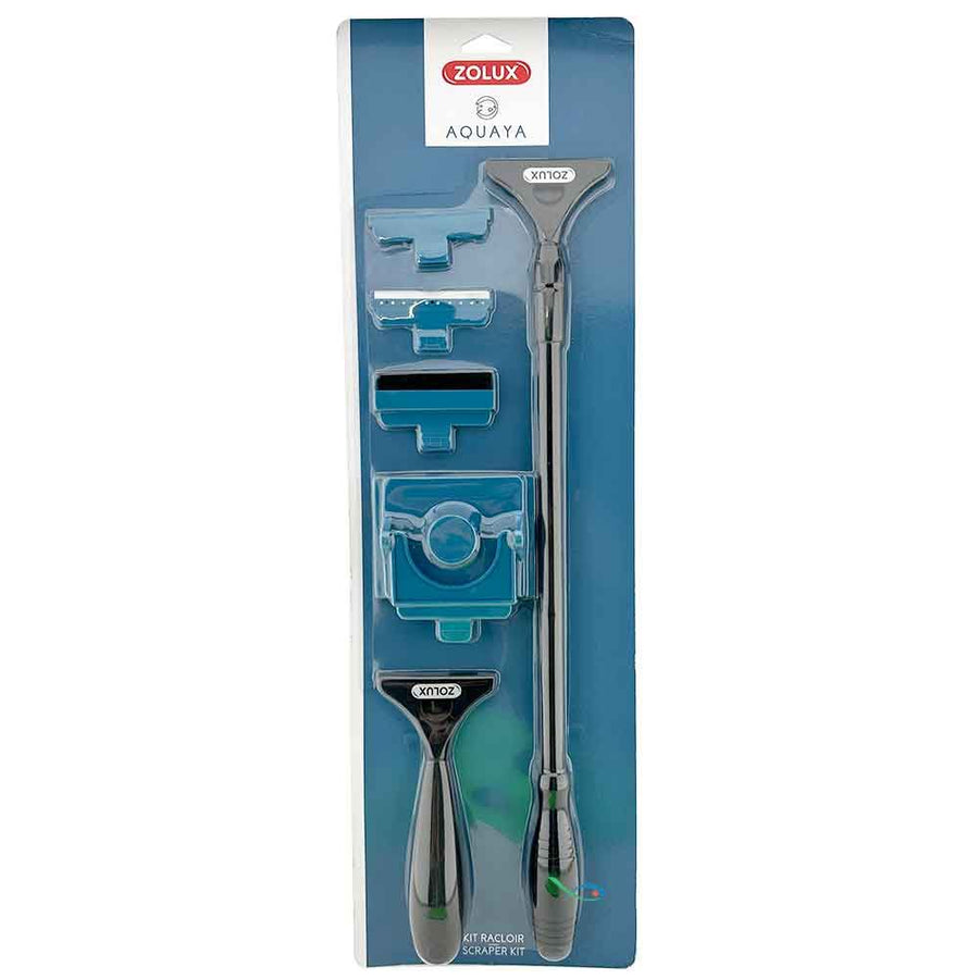 Fornito con elemento di spugna per la pulizia dei vetri, un raschietto con spugna per alghe e depositi e una lama per vetri.